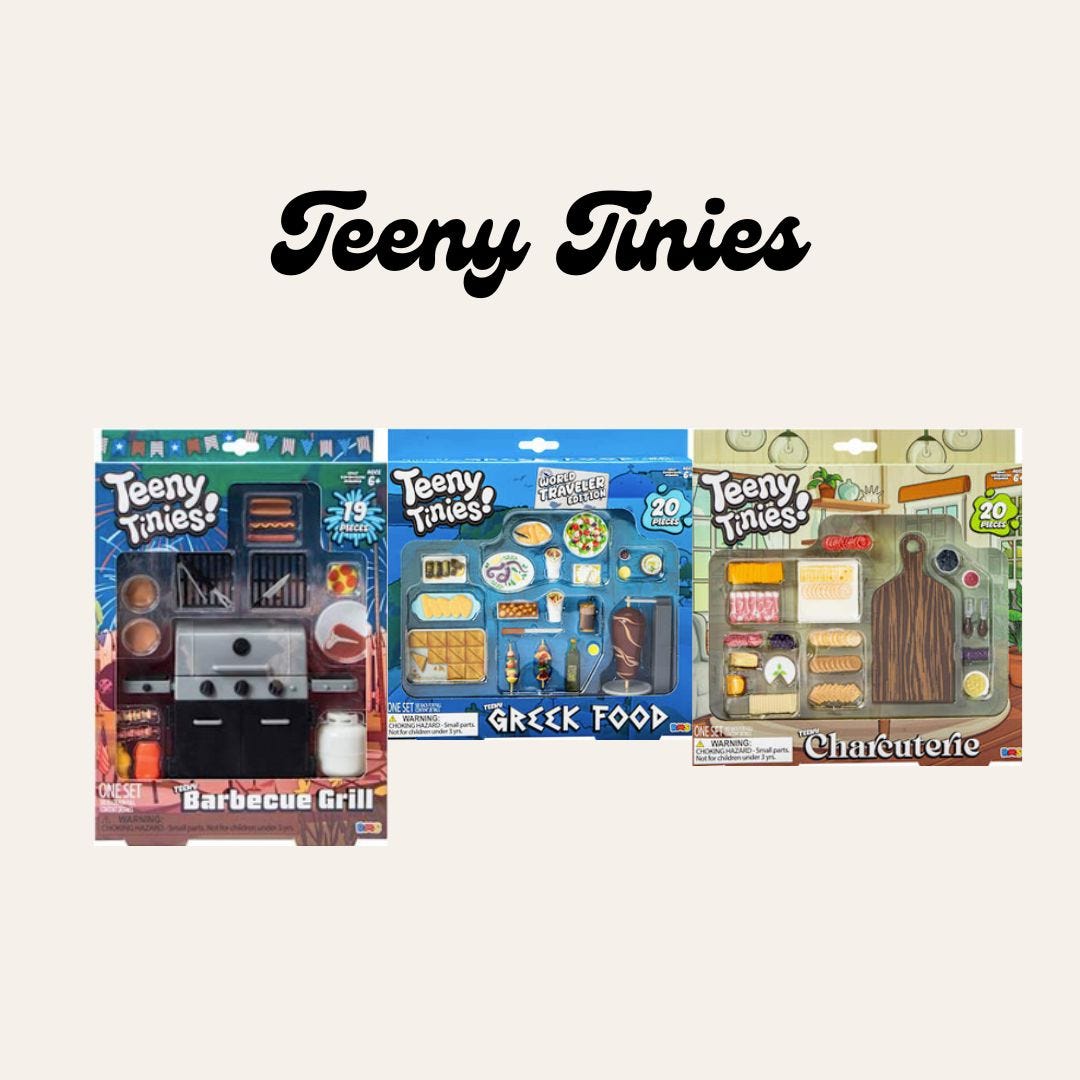 The final set I got is the Barbecue set. It comes with a grill, which I feel has to be set on something taller, bc it is rather short. It comes with a propane tank, kebabs, a hamburger with cheese and tomatoes that can be disassembled and reassembled. Grill plates, a steak on a plate that are separate pieces. A ketchup and mustard bottle, utensils, and two hotdogs and a separate bun. I truly love the detail on all the Teeny Tinies sets and at the price point of $5 versus Mini Brands it’s at the same level of quality to me . And I love Mini Brands too so